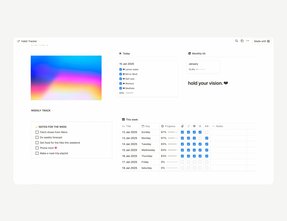Ready-to-go habit tracking dashboard for Notion with multiple database view options to chose from.